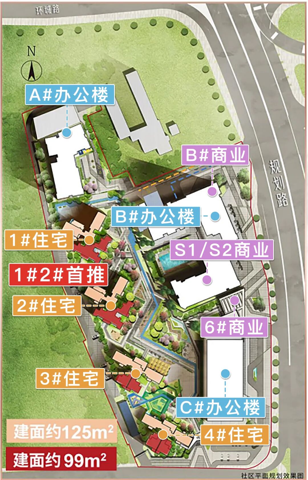 项目共规划3栋办公楼以及4栋住宅,其中1#、2#住宅为32层,3#、4#住宅为31层,高度均为103.3米。