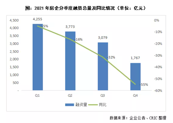 2021年,房地产行业融资政策持续收紧,典型规模房企全年融资总量同比下降26%,近五年来*次出现负增长且达到五年内*低水平。去年四季度,房企融资更是降到冰点,融资总量同比减少55%。
