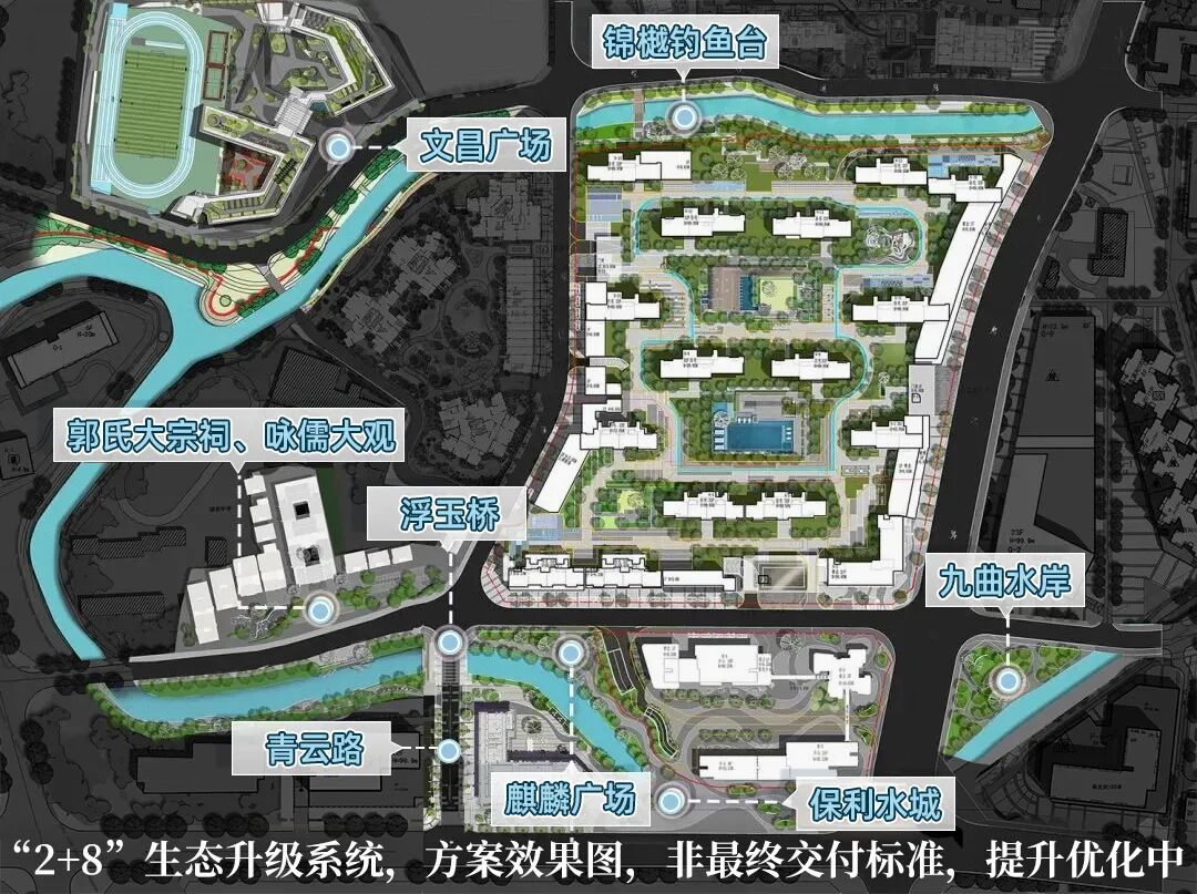 家门口有花地河休闲胜地,保利投入上亿元,打造九曲水岸、麒麟广场等“2+8”生态升级系统。