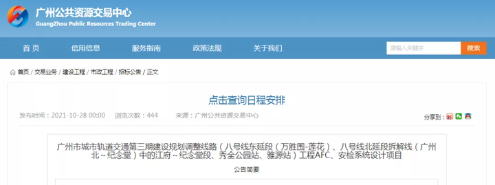 去年,广州公共资源交易*发布广州市城市轨道交通第三期建设规划调整线路,其中就包括了八号线北延段拆解线(广州北~纪念堂)工程AFC、安检系统设计项目招标公告。