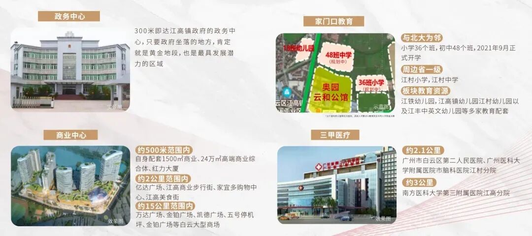 广州市白云区第二人民医院(三甲)在项目4公里范围内,驾车10*即可抵达,南方医科大学第三附属医院江高分院(三甲)在项目1.6公里内,驾车不到5*即可到达。