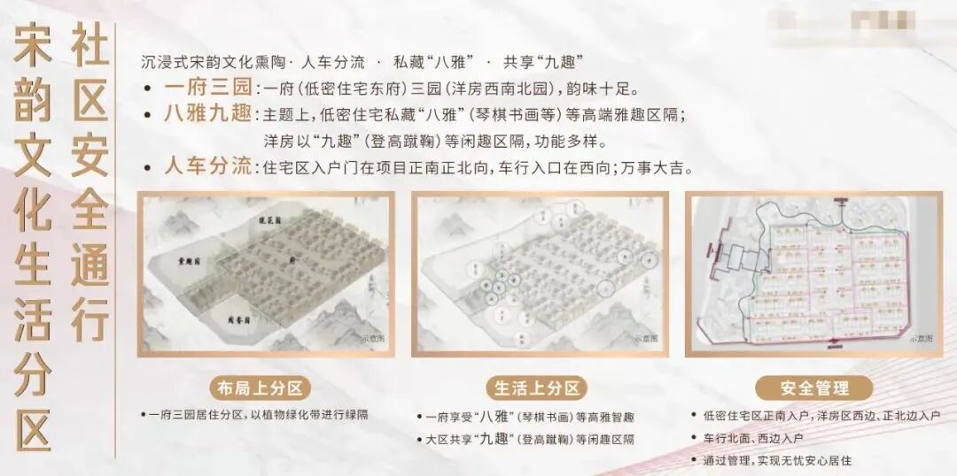 项目以“隐奢雅贵”的设计理念,打造宋代美学特色的时尚中式风格,缔造真正的城市雅奢豪宅。在规划上,低密住宅区参照《西园雅集》,以宋代坊巷文化,以12位宋代名人雅士落位坊巷园林。一巷一大家,一宅一姓氏,打造不同文人主题的意趣景观。