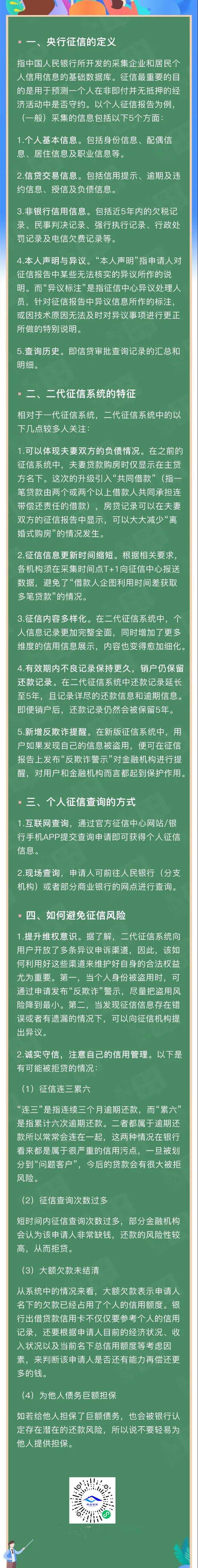 根据官方的公告,自2020年1月19日启动了二代征信系统切换工作,到今年1月1日开始全覆盖式运营!相比*代个人征信系统,第二代个人征信系统覆盖的个人信息、信贷信息等更加全面、细化及精准。
