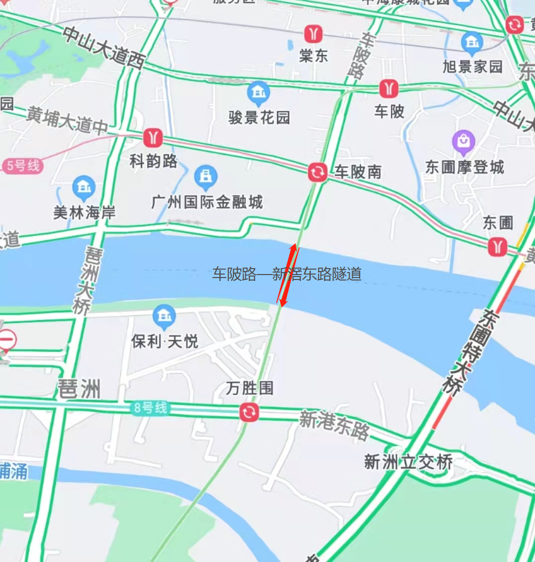 现在从车陂南路到广州保利洲际酒店一带要通过琶洲大桥过江,不仅绕路,有的时候还塞车,开车通行时间为15~30*左右。车陂路—新滘东路隧道开通后,从车陂南路可以通过隧道直达琶洲新村,无需绕路,通行时间缩短到2~5*。