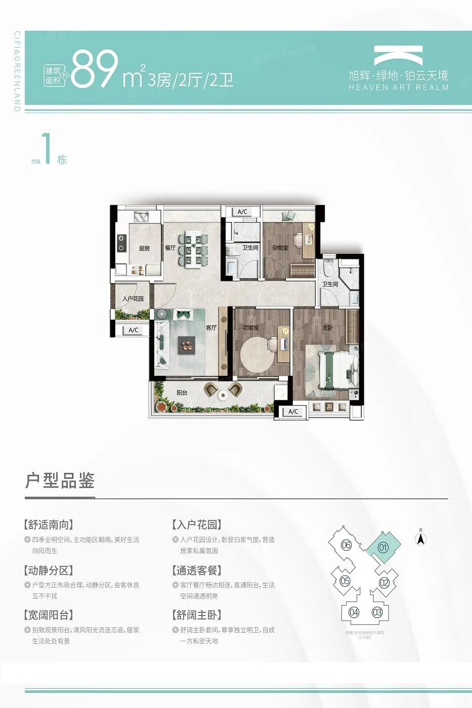 其中的89㎡三房两厅两卫,为南北对流设计。该户型不仅带有入户花园,而且还有横跨客厅和多功能房的大阳台,大大拓宽了景观视野。