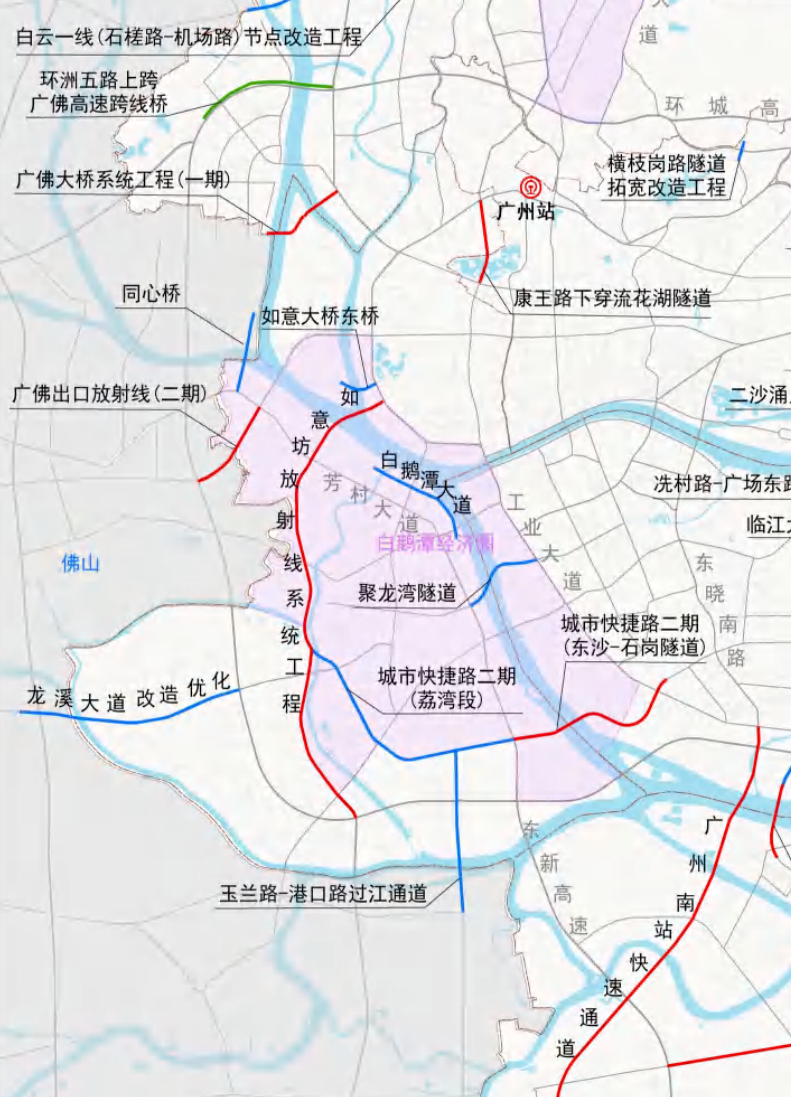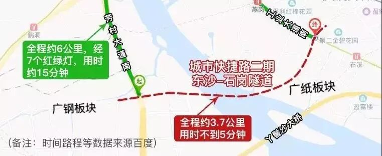 其中城市快捷路二期(东沙-石岗隧道),规划东起海珠区工业大道和新滘西路交叉口,下穿珠江及芳村大道南,快速接驳新滘西路、广州大道,串联海珠,直通天河珠江新城。