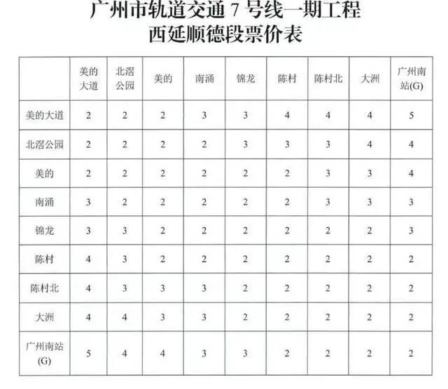 (《批复》提出,待广州南(G)和广州南(F)实现无障碍换乘后,重新核定线网票价。上述票价自广州市轨道交通7号线一期工程西延顺德段正式开通运营之日起执行,有关票价优惠按广州、佛山两市有关规定执行。)