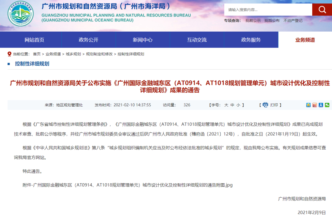 2021年2月份,《广州国际金融城东区(AT0914、AT1018规划管理单元)城市设计优化及控制性详细规划》正式获广州市政府批准,并由广州市规划和自然资源局公布实施。