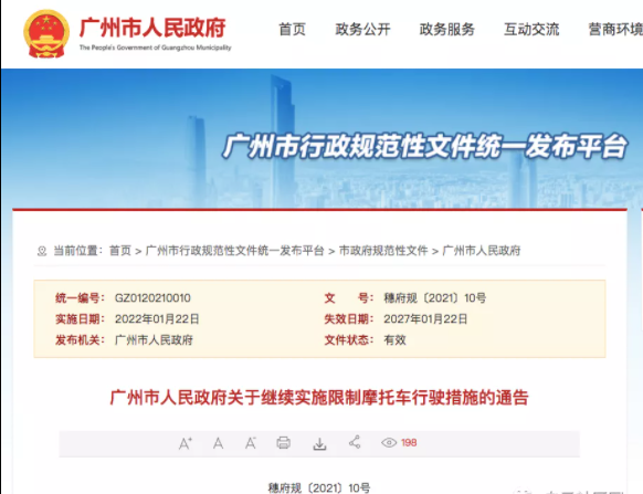 此次向社会公告广州市“限摩”范围的文件自2022年1月22日起施行,有效期5年。