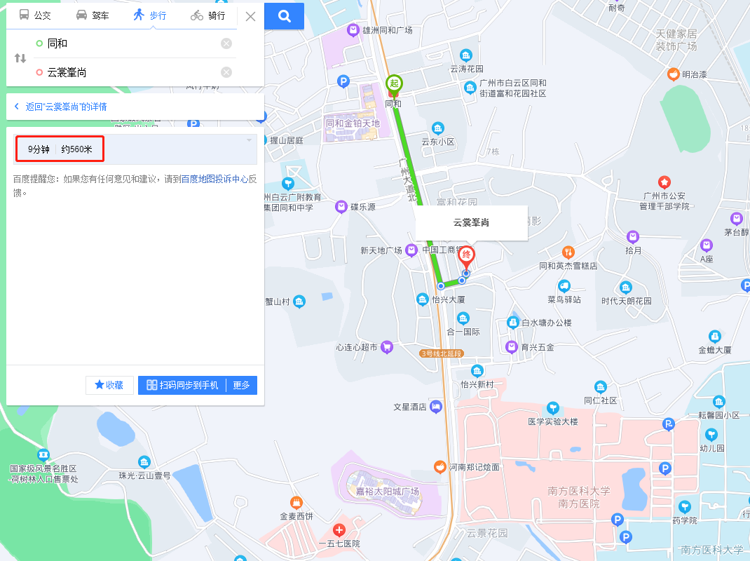 云裳峯尚位于广州大道北、白云同和,根据地图显示,与同和地铁站步行距离约500米,步行9*就能到达。