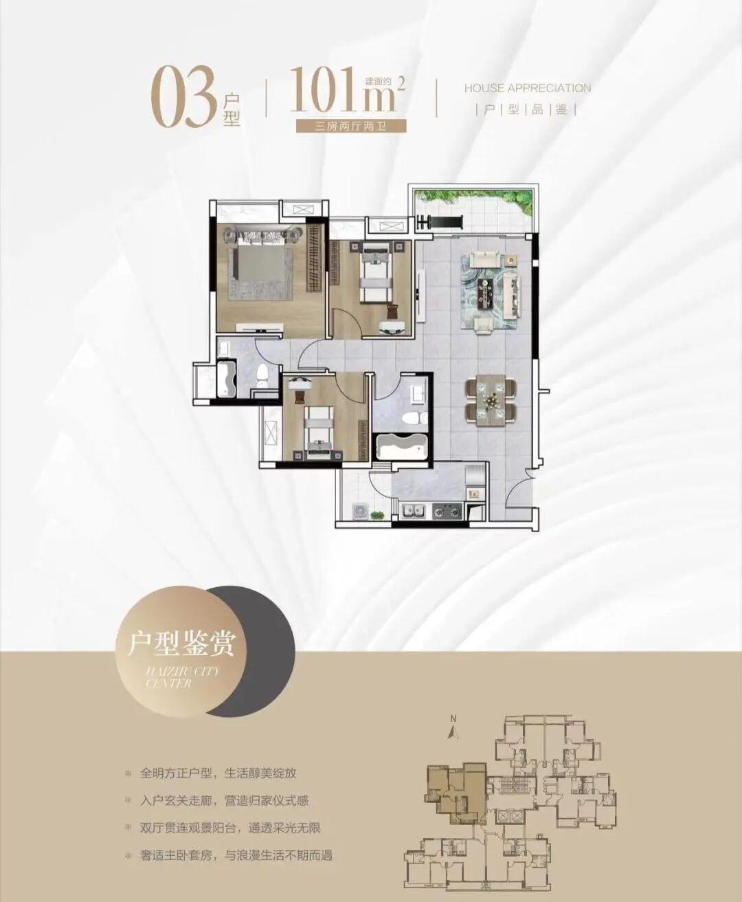 约101㎡户型,格局类似,但升级为三房带主套,空间相对实用一些。