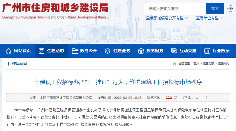 2月9日,广州住房和城乡建设局发布消息称,广州市建设工程招标管理办公室发布《关于开展房屋建筑工程施工项目负责人社会保险缴纳单位信息比对工作的指引》(下称《指引》),通过交易系统自动比对项目负责人社会保险缴纳单位信息,可查处打击招投标活动“挂证”行为,进一步维护广州市建筑工程市场秩序,营造良好的招标投标营商环境。根据《指引》,为营造良好的招标投标营商环境,维护建筑工程招投标市场秩序,遏制招投标活动中"挂证"行为,将对依法必须招标的房屋建筑工程施工项目负责人社会保险缴纳单位信息开展比对工作。有关事项指引包括:一、投标人应及时维护项目负责人社保信息,并在投标前再次核对投标文件中拟派项目负责人社保信息与投标人的一致性。拟派项目负责人在签字确认投标文件时,应确保社保信息与投标人的一致。交易系统比对后发现存在社保信息不一致情形的,将向相关投标人和项目招投标监管部门推送提示信息。二、中标候选人存在社保信息不一致情形的,交易系统将向招标人推送提示信息。为使招标项目顺利推进,避免定标风险,招标人可在定标前就相关问题向中标候选人进行核实。三、招投标监管部门将暂停向交易系统推送广州市住房和城乡建设局企业诚信档案信息库中社保信息不一致项目负责人诚信档案信息,并启动调查。上述指引自2022年3月1日起执行。广州住房和城乡建设局表示,在本次项目负责人社保信息比对工作中,市建设工程招标办一以贯之推行招标人负责制。中标候选人的项目负责人社保缴纳单位与投标单位不一致的,交易系统将及时向招标人推送提示信息,充分保障了招标人的知情权。为避免产生定标风险,招标人可就相关问题向中标候选人进行核实,确保招标项目稳步推进。对投标人而言,《社保信息比对指引》既是一份“投标指南”,又是一份“风险警示函”,明确告知了投标人应及时维护项目负责人社保信息,投标前要核对拟派项目负责人社保信息的一致性;项目负责人社保信息存在不一致情形的,招投标监管部门将启动调查,并暂停向交易系统推送广州市住房和城乡建设局企业诚信档案信息库项目负责人诚信档案信息,对招投标“挂证”行为进行严厉打击。 来源:广州房产之家