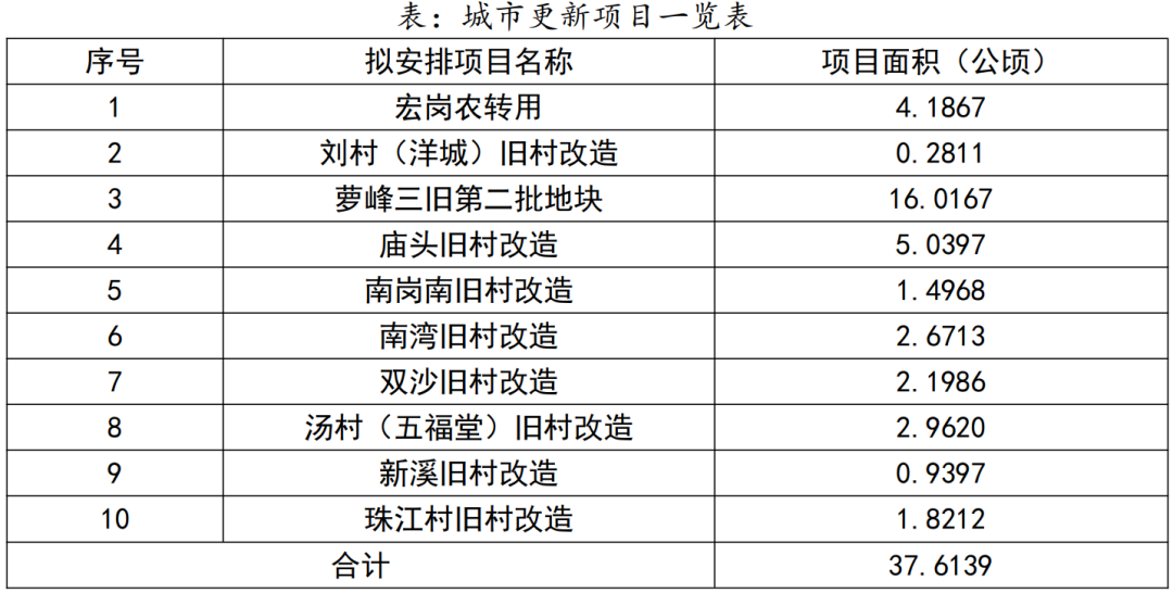 这10个旧改项目分别为:宏岗农转用项目、洋城岗旧改、萝峰旧改第二批地块、庙头旧改、南岗南片旧改、南湾旧改、双沙旧改、汤村五福堂旧改、新溪村旧改、珠江村旧改。