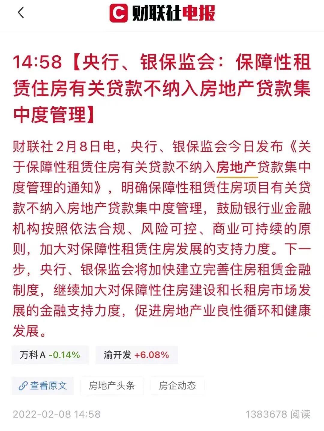 2月8日,人民银行、银保监会发布《关于保障性租赁住房有关贷款不纳入房地产贷款集中度管理的通知》(下称“《通知》”),明确自该通知印发之日起,银行业金融机构向持有保障性租赁住房项目认定书的保障性租赁住房项目发放的有关贷款不纳入房地产贷款集中度管理,并提出银行业金融机构要加大对保障性租赁住房的支持力度。