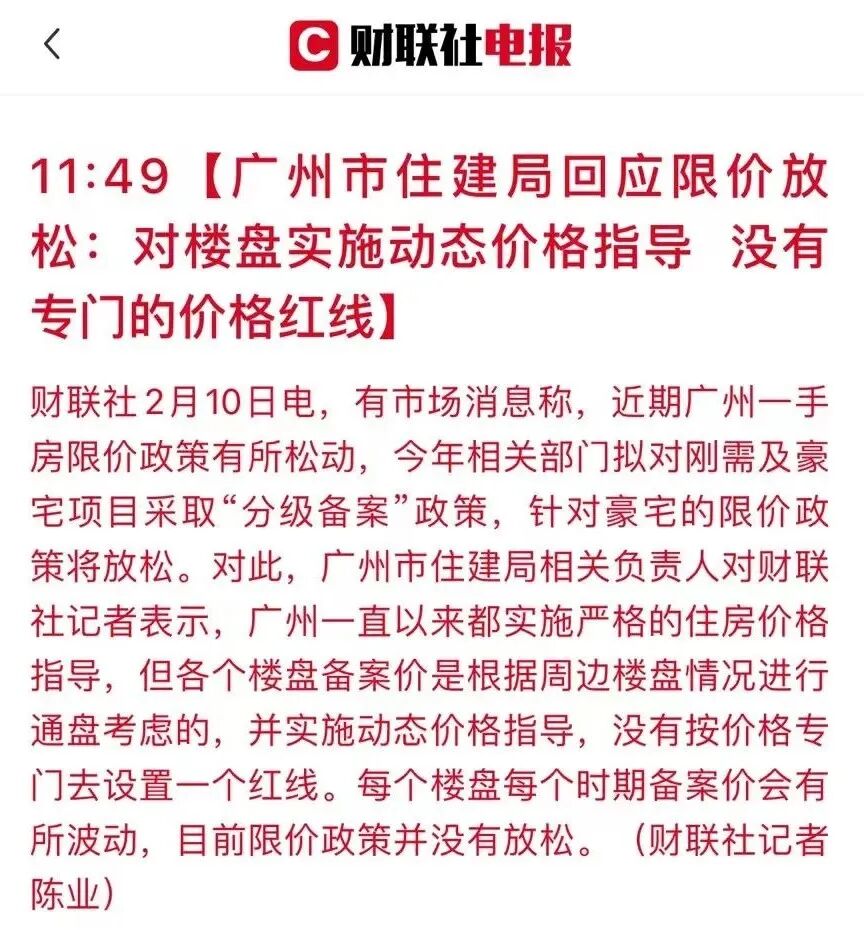 据财联社10日消息,近期广州一手房限价政策有所松动,今年相关部门拟对刚需及豪宅项目采取“分级备案”政策,针对豪宅的限价政策将放松。对此,广州市住建局相关负责人表示,广州一直以来都实施严格的住房价格指导,但各个楼盘备案价是根据周边楼盘情况进行通盘考虑的,并实施动态价格指导,没有按价格专门去设置一个红线。每个楼盘每个时期备案价会有所波动,目前限价政策并没有放松。一位房地产服务机构分析师向记者表示,目前尚无法确认分级备案是否已成为新的规则,但此前确实有房企向当地政府提议豪宅项目不用限价。