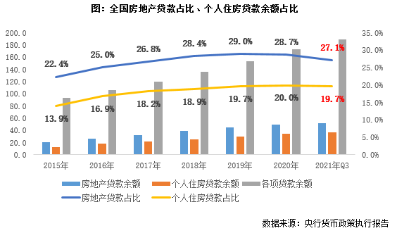 2021年全年的*新数据为:房地产贷款余额占比回落*27.07%;个人住房贷款占比为19.88%。