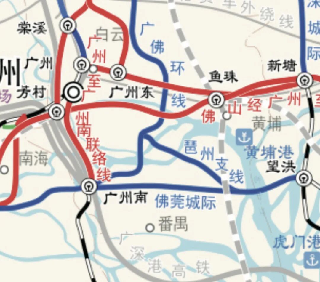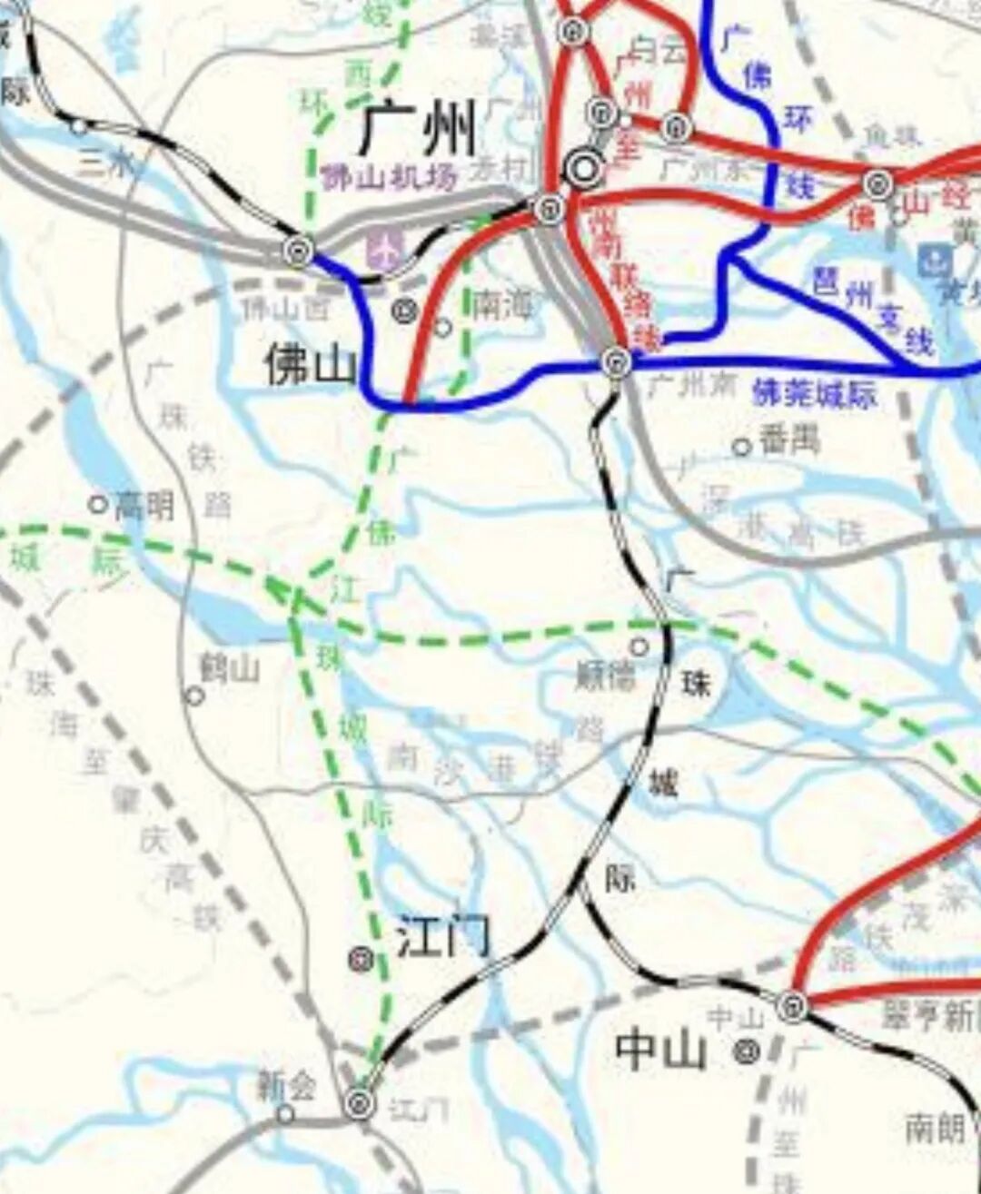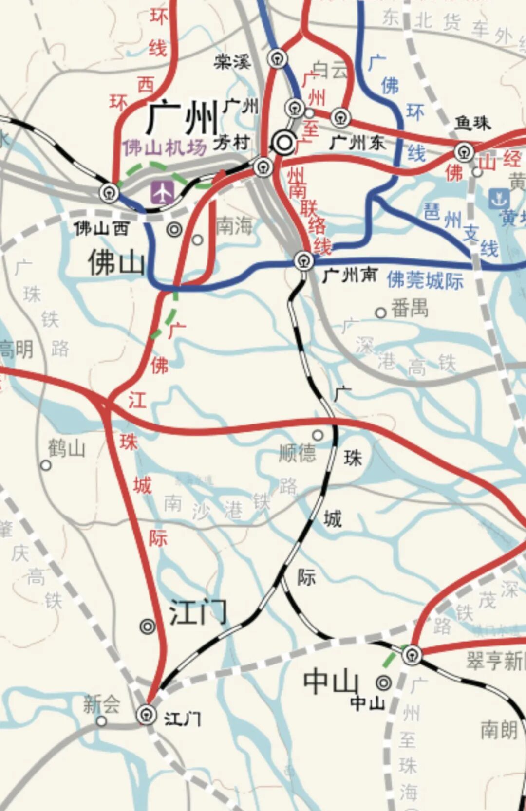 △*新调整,东平新城以南新增联络线,即图中绿色虚线,接上广佛江珠城际