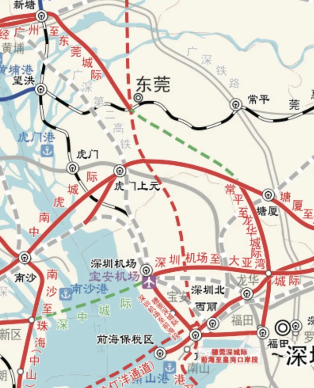 △左上方红线为佛穗莞城际原走向,线路到东莞为止,东莞到深圳另外建设常平*龙华城际