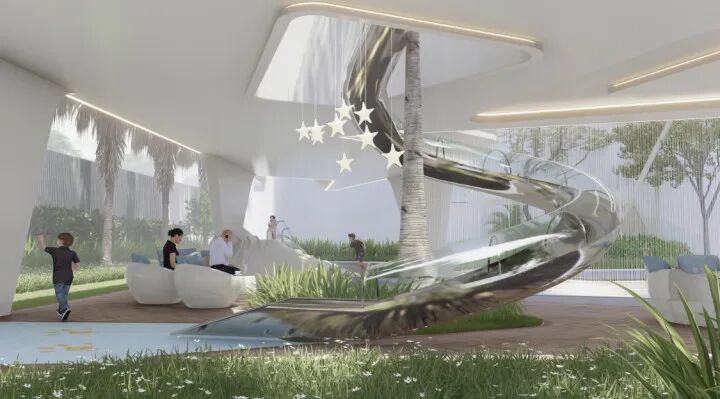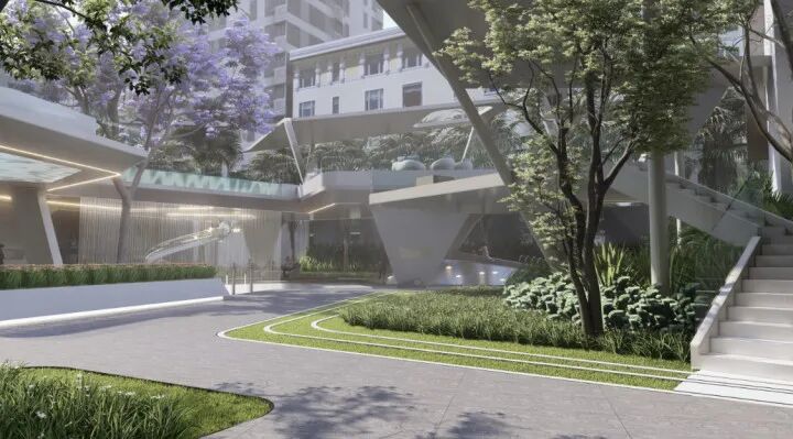 五重立体花园:林下广场、空中悬浮泳池、架空会所、空中会客厅、屋顶生态花园。