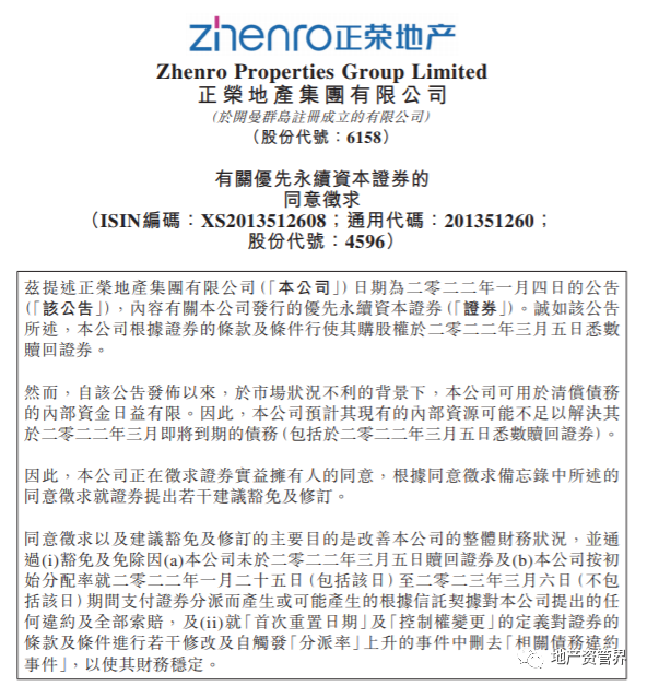 正荣地产希望债券持有人能够豁免及免除公司因未能在3月5日赎回上述永续债及支付证券分派款项,而对公司提出的任何违约及索赔,并就“*次重置日期”及“控制权变更”的定义对证券的条款及条件进行若干修改及自触发“分派率”上升的事件中,删去“相关债务违约事件”,以使其财务稳定。