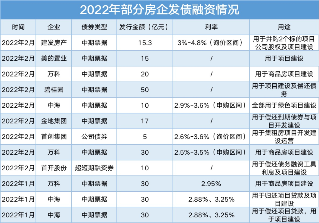 2月21日,万科发布2022年度第三期中期票据募资说明书,本次中期票据注册额度为20亿元,*期一次性发行,拟全部用于商品房项目建设。本期募集资金拟用于三个住宅项目的开发建设,包括万科雪山二期A11地块、沈阳翡翠观湖一分期项目、西安澜岸项目,预计总投资金额分别为15.26亿元、18.15亿元及33.50亿元。据悉,万科于年内计划及完成发行的中期票据共计三笔,募资金额共计80亿元,且募集资金均用于商品房项目建设。其中,*期中期票据发行金额30亿元,主要用于重庆市永川万科城一期、二期以及佛山金域半岛一期、万科雪山二期A6地块建设项目、万科雪山二期A8地块建设项目等5个住宅项目建设开发。第二期中期票据发行金额为20亿元,投资对象则为山东济南万科雪山二期A13地块建设项目以及沈阳浑南新都心一期分期项目。与此同时,根据市场消息透露,万科此前发行的*期中票利率为2.95%,较其于2021年9月的3年期中票利率下降13bp。而第二期中票利率询价区间在2.50%-3.50%,成本保持在行业低位。不止是万科,据观点指数不完全统计,年内有超过十家房企通过发债融资为项目开发筹集资金,包括碧桂园、中海、美的、建发、*创、*开、金地等,募资资金近300亿元,实际投入项目建设的金额超200亿元。 来源:广州房产之家