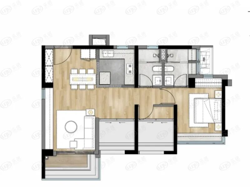 该户型和珠江花城建面约76㎡的户型基本一致,但是多了1个卫生间,更加适合多口之家使用。