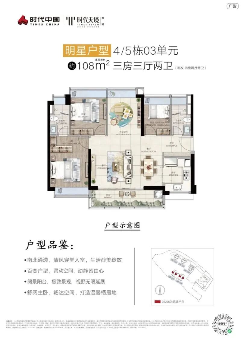 建面约108㎡ 三房三厅两卫(可改四房两厅两卫)