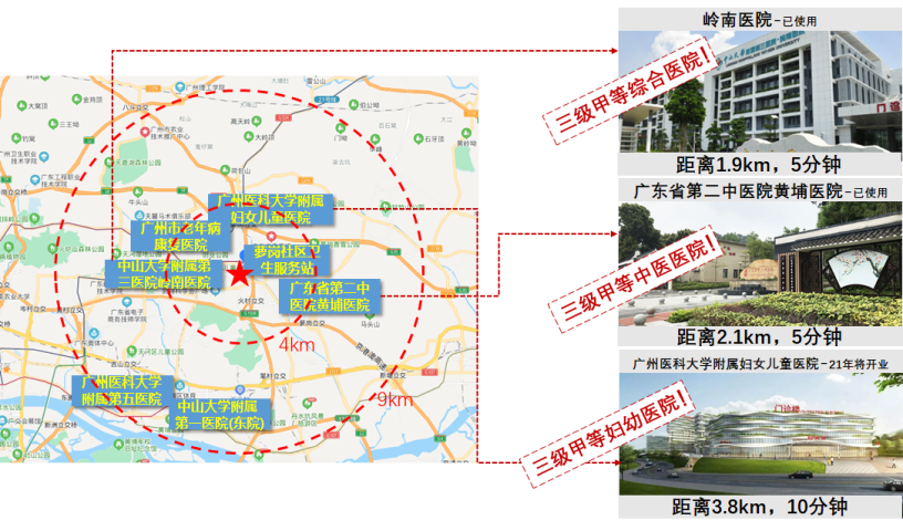 4km内三大三甲医院配套,岭南医院、广东省第二中医院黄埔医院、广州医科大学附属妇女儿童医院,为健康安全保驾护航