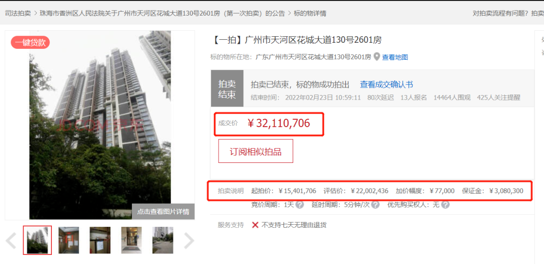 2月23日,据京东拍卖平台交易结果显示,经公开竞价,广州市天河区花城大道130号2601房以3211.07万元的成交价成功拍出。据了解,标的物建筑面积为170.5765平方米,位于第26层 ,共43层。该标的物估值总价为2200.24万元,起拍价为1540.17万元。该房产单位位于珠江新城颐德公馆,拍卖过程中,80次延迟,竞价104次,*终以约18.8万/平方米的楼面价成交。据悉,该房产已被查封、抵押,还涉及债务纠纷,不过原业主愿意配合过户。公开资料显示,珠江颐德公馆(珠江璟园)位于花城大道上,与珠江公园一路之隔。珠江颐德公馆占地2.2万平方米,总建筑面积13万平方米,总户数398户。据了解,颐德公馆小区当前挂牌价在20-30万/㎡不等。其中低楼层挂牌价:20-28万/㎡,中高层挂牌价:20-30万/㎡。 来源:广州房产之家