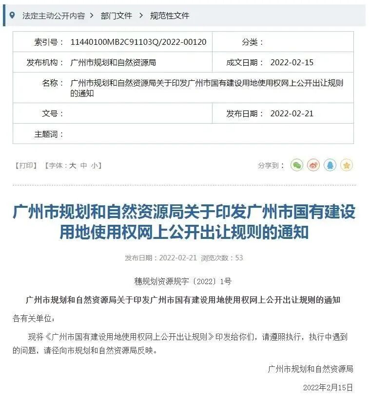2月21日,广州市规划和自然资源局发布了《关于印发广州市国有建设用地使用权网上公开出让规则的通知》。