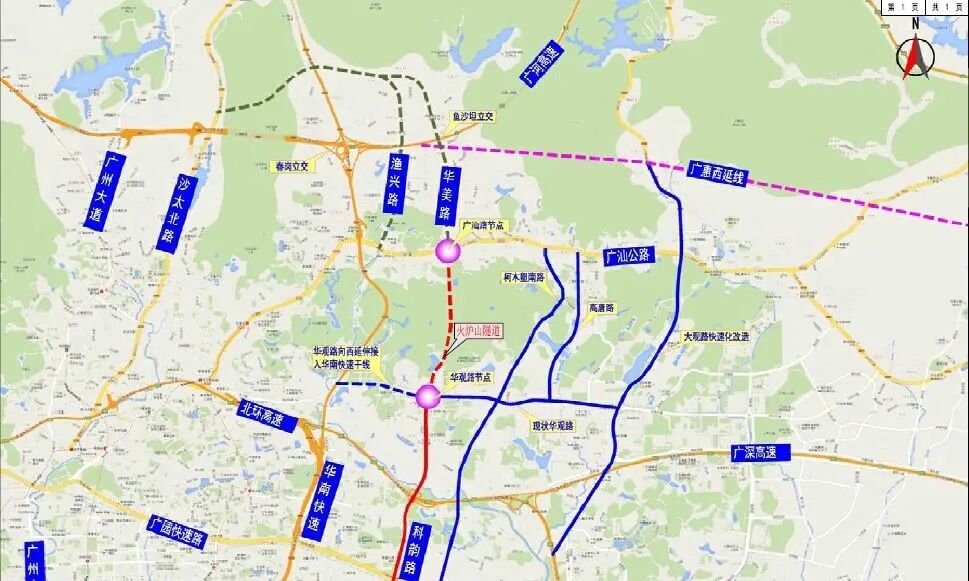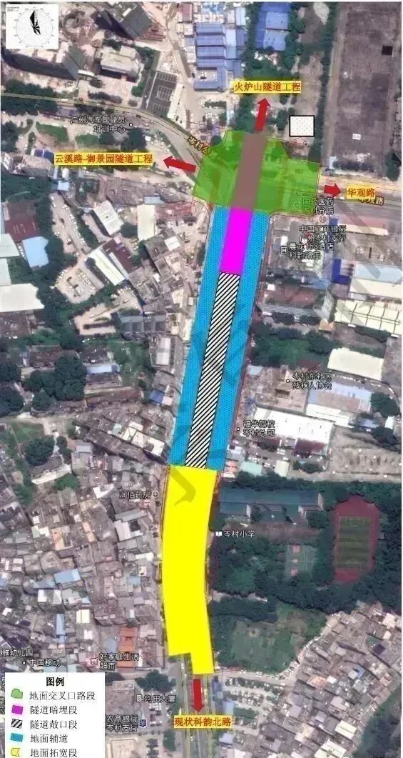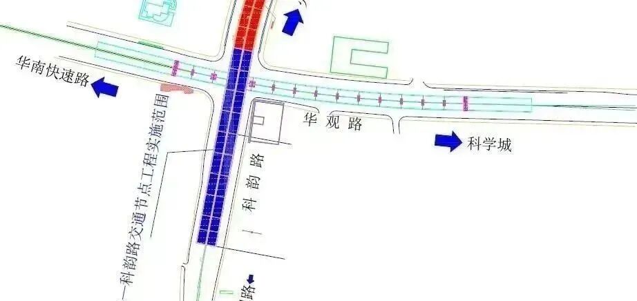 华观路—科韵路交通节点工程项目拟新增科韵路南北向下沉式隧道,并升级改造交叉范围内的道路。隧道全长309米,隧道主线双向4车道,设计速度60千米/*,东侧辅道为4车道,西侧辅道为3车道,设计速度40千米/*。