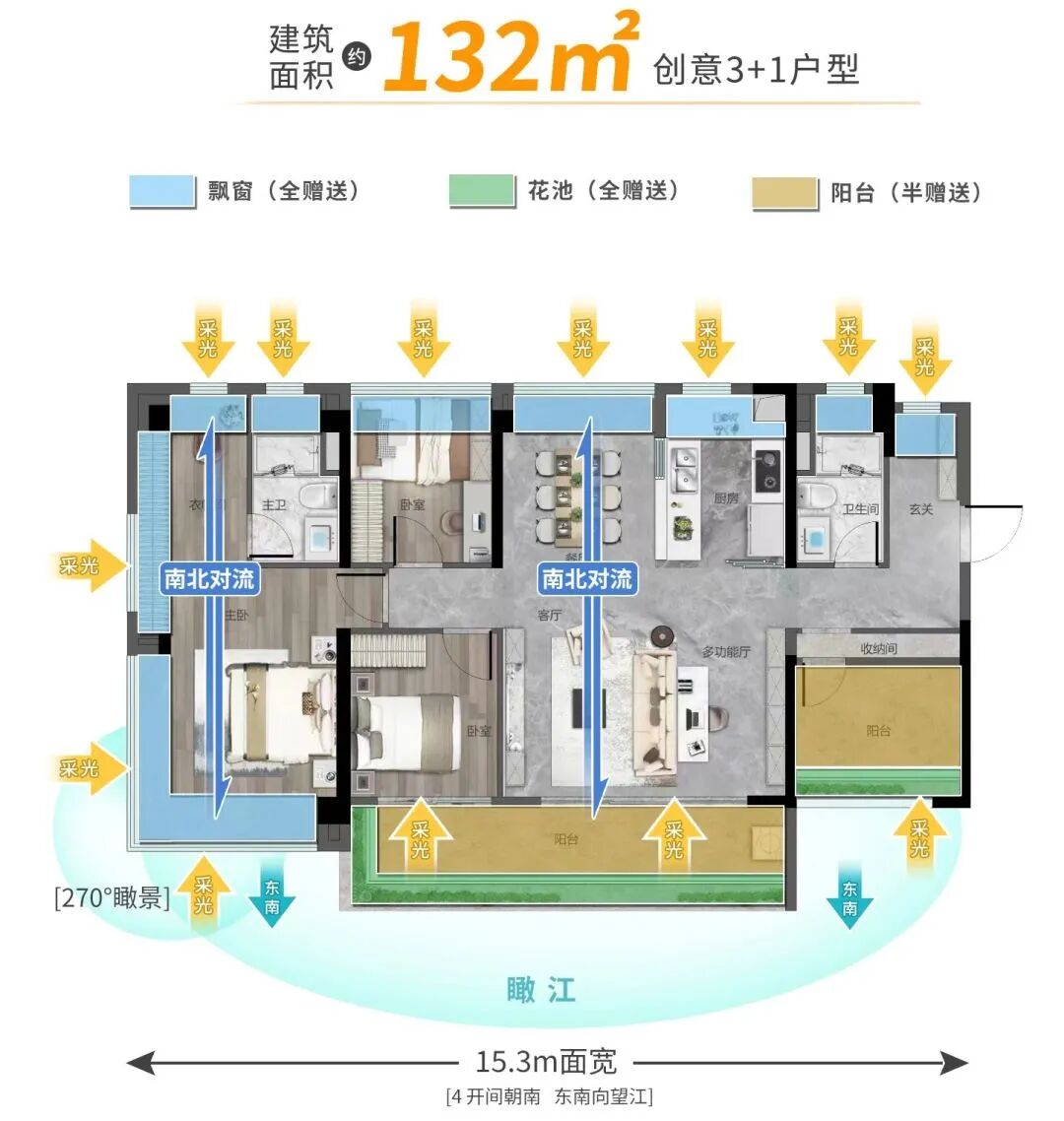 建面约132㎡户型,面宽约15.3米,构筑约8.2X1.9m跑道式阳台,比肩市面约165㎡户型配置。