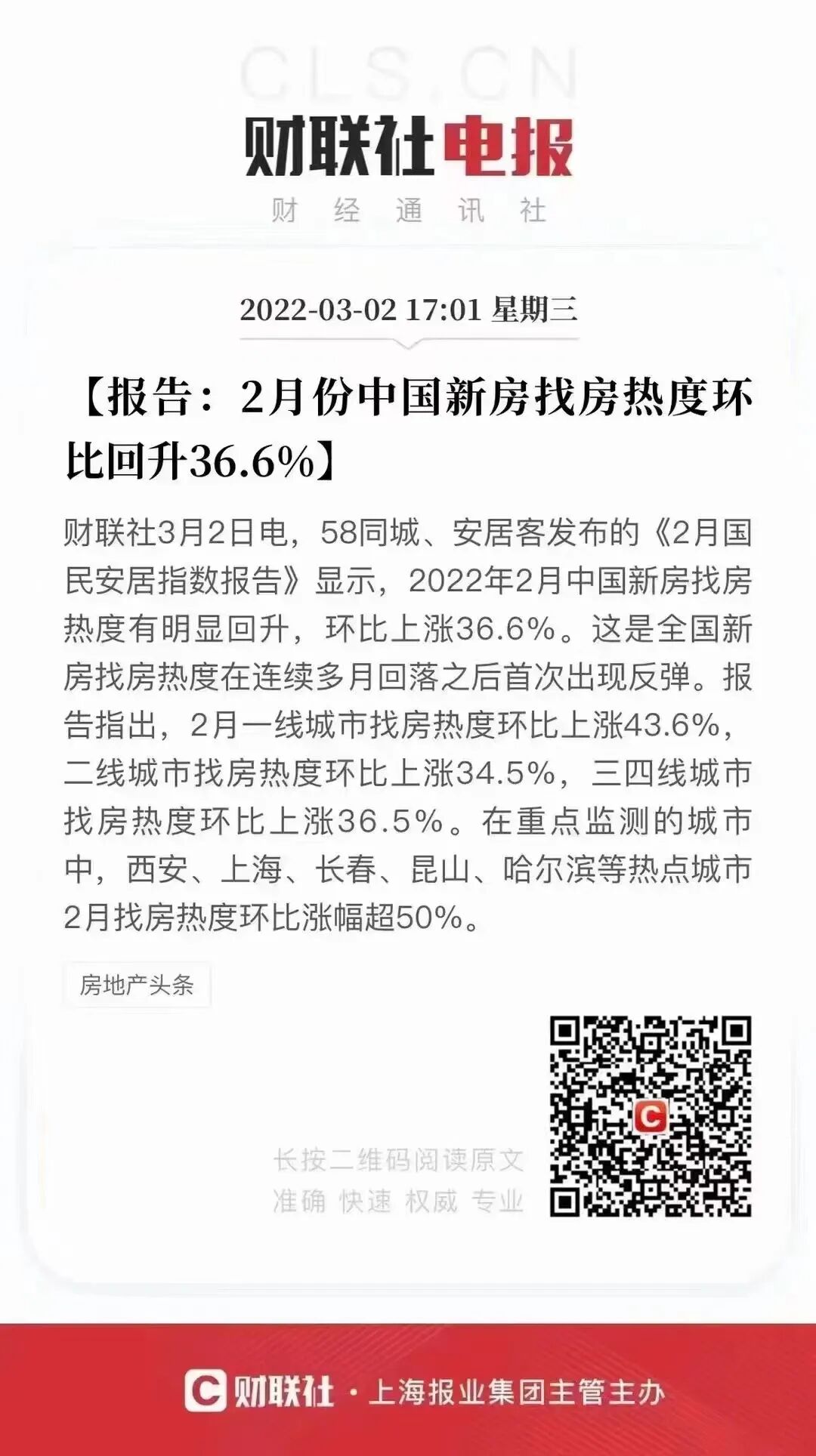 58同城、安居客2日发布的《2月国民安居指数报告》显示,2022年2月中国新房找房热度有明显回升,环比上涨36.6%。