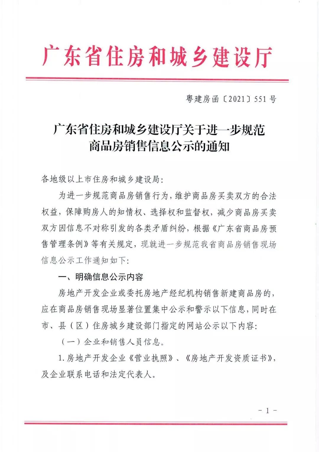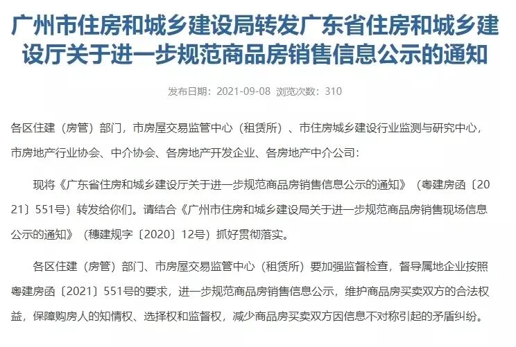 9月8日,广州市住房和城乡建设局发布关于《广州市住房和城乡建设局转发广东省住房和城乡建设厅关于进一步规范商品房销售信息公示的通知》。