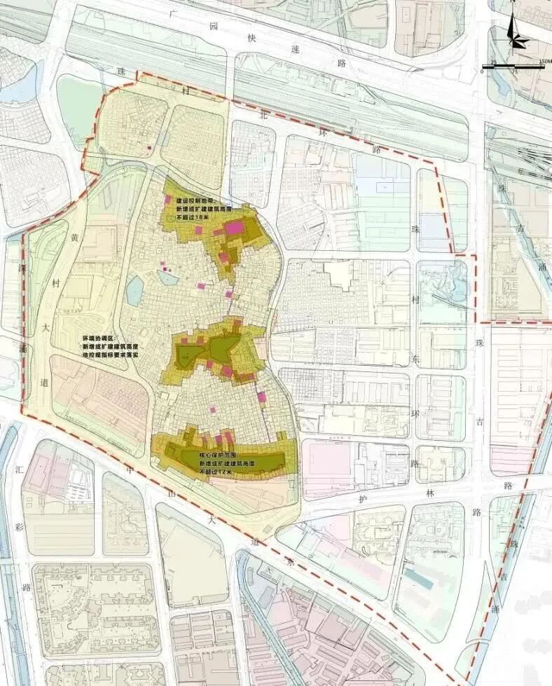 环境协调区:珠村传统村落范围。东*文华大街·深涌-东乔大道;西*深涌;北*广园快速路南*中山大道,总面积约40.66公顷。