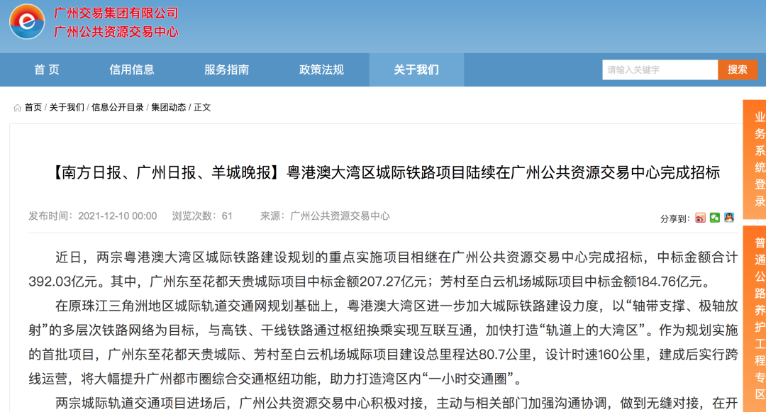 近日,广州公共资源*发布了《粤港澳大湾区城际铁路项目陆续在广州公共资源交易*完成招标》公告。