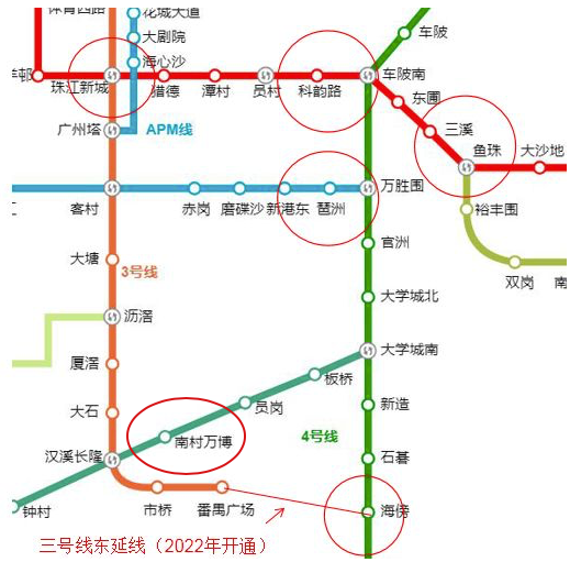 如果以亚运城的海傍站为出发点,似乎去珠江新城、琶洲、金融城、鱼珠、万博、南沙都可以在三四十*内解决。