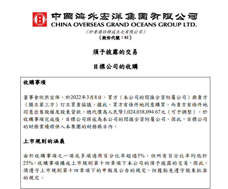 昨日,中国海外宏洋集团有限公司发布公告称,于2022年3月8日,买方中海宏洋地产集团有限公司与卖方汕头市龙光博皓投资咨询有限公司(独立第三方)订立买卖协议,据此,买方有条件地同意购买,而卖方有条件地同意出售股权及股东贷款,总代价为人民币10.24亿元(可予调整)。于收购事项完成后,目标公司汕头市龙光景耀房地产有限公司将成为中海宏洋间接全资附属公司,因此,目标公司的财务业绩将并入集团的财务账目内。据悉,买方有条件地同意购买,而卖方有条件地同意出售股权(不附带任何产权负担,即目标公司汕头市龙光景耀房地产有限公司全部股权的100%),及股东贷款(即于买卖协议日期,目标公司欠卖方的全部未偿还贷款,总金额为人民币9.76亿元,惟须受买卖协议的条款及条件约束。卖方的股东深圳市龙光控股有限公司及深圳市禹德盈投资有限公司已分别向买方就卖方在买卖协议项下的义务提供担保,担保期为卖方就完成交易的所有义务履行完毕日起计三年。资料显示,目标公司为一家于2020年6月在中国成立的有限责任公司,注册资本为人民币6亿元,于买卖协议日期,由卖方全资持有。目标公司的主要业务为于中国从事房地产开发经营、房地产咨询及营销方案策划。目标公司的主要业务为开发于广东省汕头市东海岸新城新津片区的物业。于该公告日期,目标公司由卖方全资持有。于收购事项完成后,买方将持有目标公司全部股权的100%,而目标公司将成为本公司的间接全资附属公司,根据买卖协议,买方将享有关于目标公司自2022年2月28日起的利润及盈馀的股权权利。此外,目标公司的主要资产为物业,该物业位于中国广东省汕头市东海岸新城新津片区的地块,地块编号E01-15。物业地盘面积约5.31万平方米,拟发展为住宅物业。目前正在兴建中,其中住宅物业的预售预计将于2022年10月开始,并预计将于2024年6月竣工。据了解,中海宏洋此次收购地块,为龙光2020年6月15日所拿。彼时,龙光以14.91亿元竞得编号WG2020-15宗地,地块位于东海岸新津片区E组团,楼面价7019元/平方米,溢价率20.63%。 来源:广州房产之家