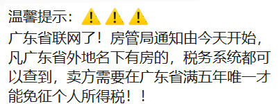 大概内容是目前在广州市卖房子,需要在广东省满五年*才能免征个人所得税!