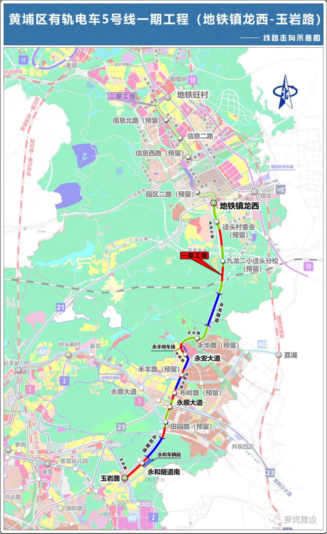据亮点好房研究院了解,黄埔有轨电车5号线项目起于地铁镇龙西站,止于玉岩路站,线路长14.41km,其中:地面线 4.445km、地下线 4.415km、高架线 5.55km。一期共设车站 5 座,平均站间距 3.637km,其中*大站间距 7.489km(地铁镇龙西-永安大道),*小站间距 0.777km(永和隧道南-玉岩路),一期工程新建一段一场,在线路南部设永和车辆段,接永和隧道南站。于华峰路设永丰停车场,接轨永安大道站,出入段线长约 490m,出入场线长约 70m。一期工程含山岭隧道 2 座,其中利用既有公路隧道一座,长约 0.935km,新建单洞双线山岭隧道 1 座(永龙隧道段),长度约 2.10km。*高设计速度 70km/h。采用半专用路权模式。