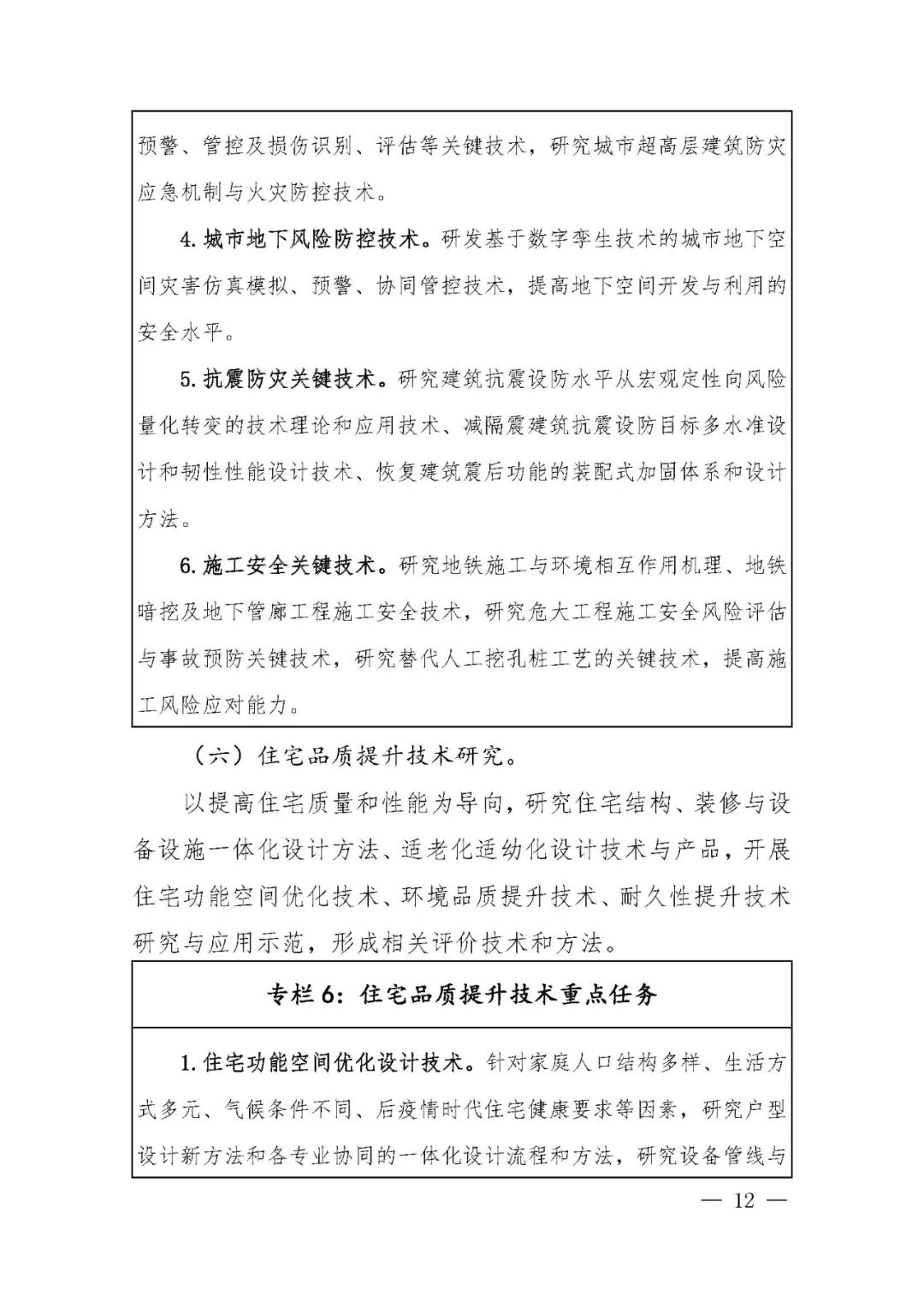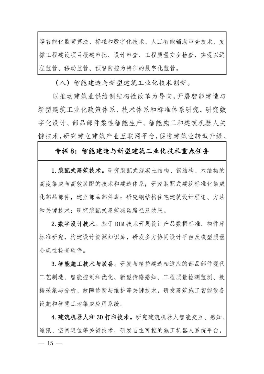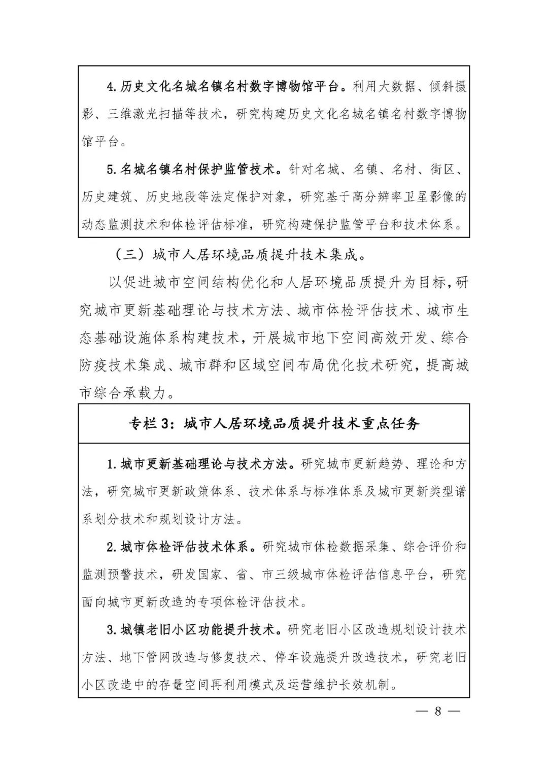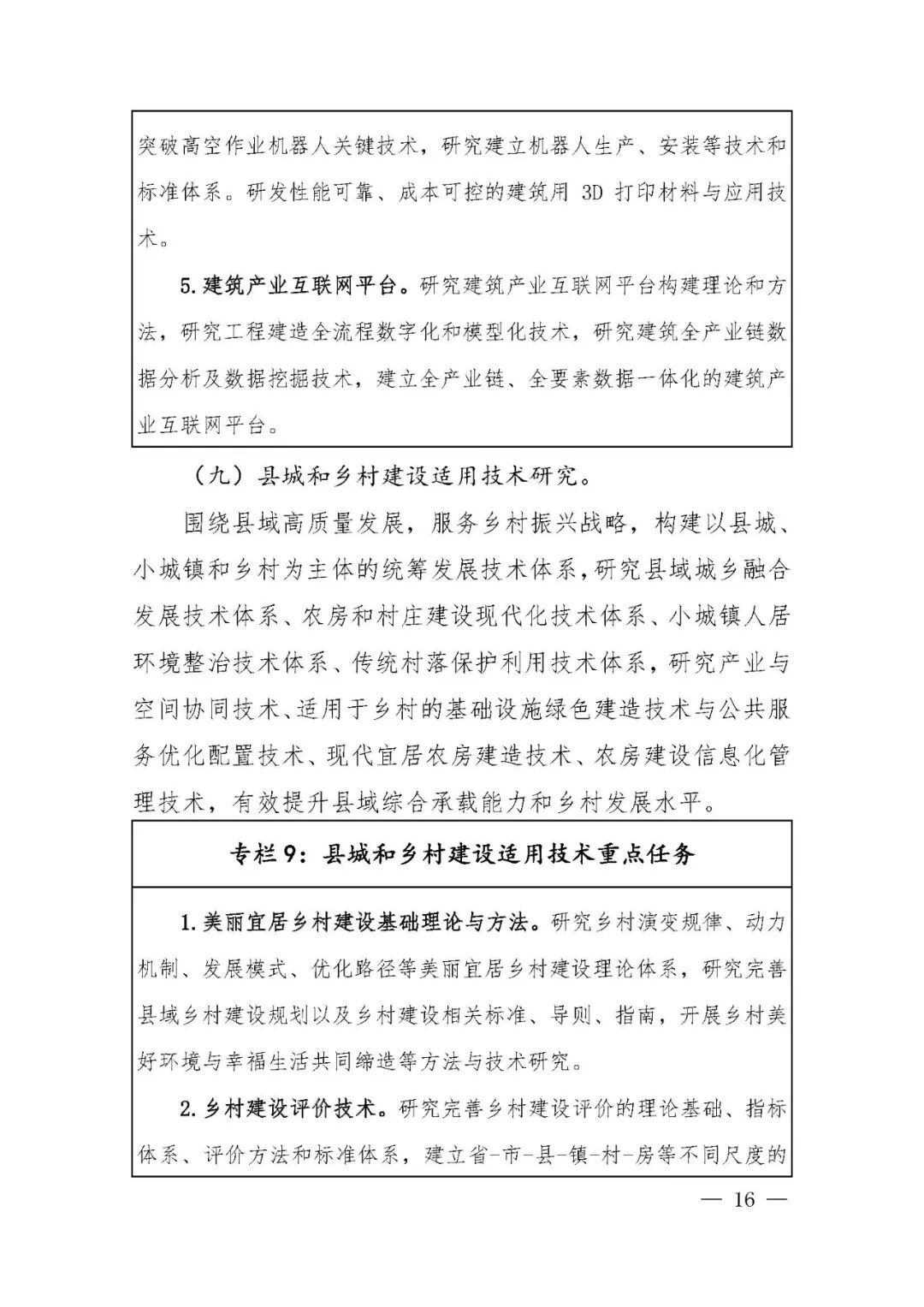 规划聚焦“十四五”时期住房和城乡建设*任务,在城乡建设绿色低碳技术研究、城乡历史文化保护传承利用技术创新、城市人居环境品质提升技术、城市基础设施数字化网络化智能化技术应用、城市防灾减灾技术集成、住宅品质提升技术研究、建筑业信息技术应用基础研究、智能建造与新型建筑工业化技术创新、县城和乡村建设适用技术研究9个方面,加强科技创新方向引导和战略性、储备性研发布局,突破关键*技术、强化集成应用、促进科技成果转化。