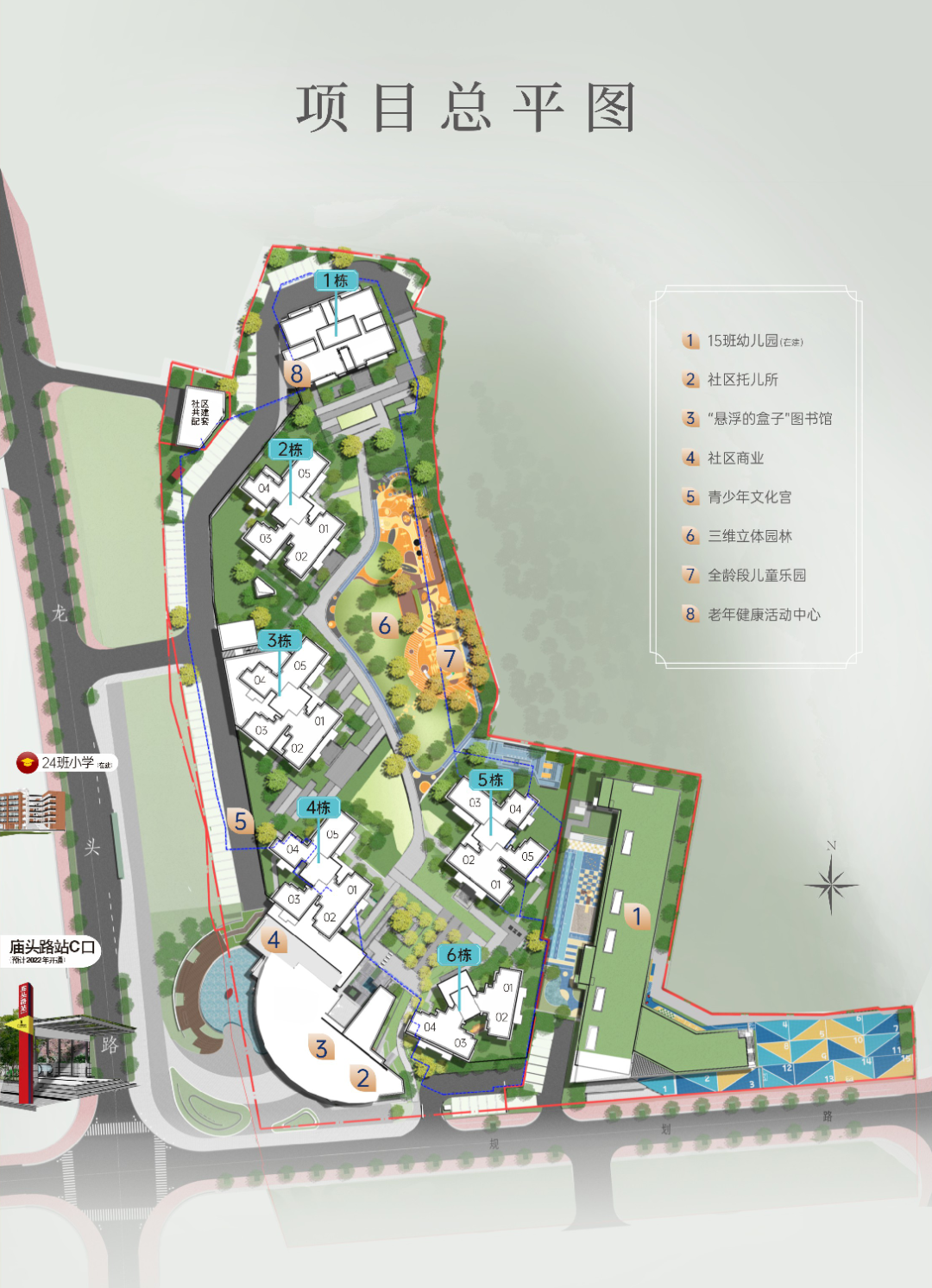 项目内配建托儿所以及15班幼儿园、项目西侧配建24班小学。