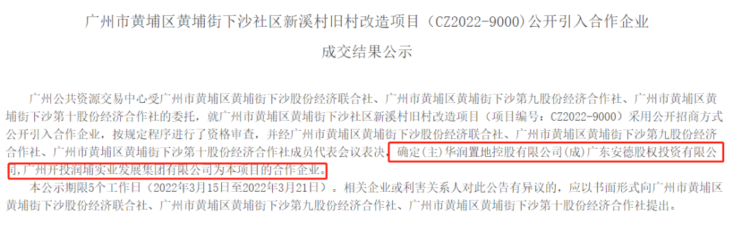 3月14日,广州市黄埔区黄埔街下沙社区新溪村旧村改造项目公开引入合作企业成交结果公示。