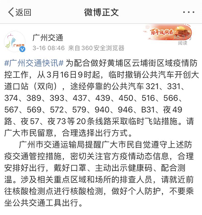 广州交通消息:为配合做好黄埔区云埔街区域疫情防控工作,3月16日9时起,广州市交通运输局 临时撤销公共汽车开创大道口站(双向),途经停靠的公共汽车321、331、374、389、393、437、439、450、516、566、567、569、572、579、940、946、B31、夜49路、夜57、夜73等20条线路采取临时飞站措施。请广大市民留意,合理选择出行方式。