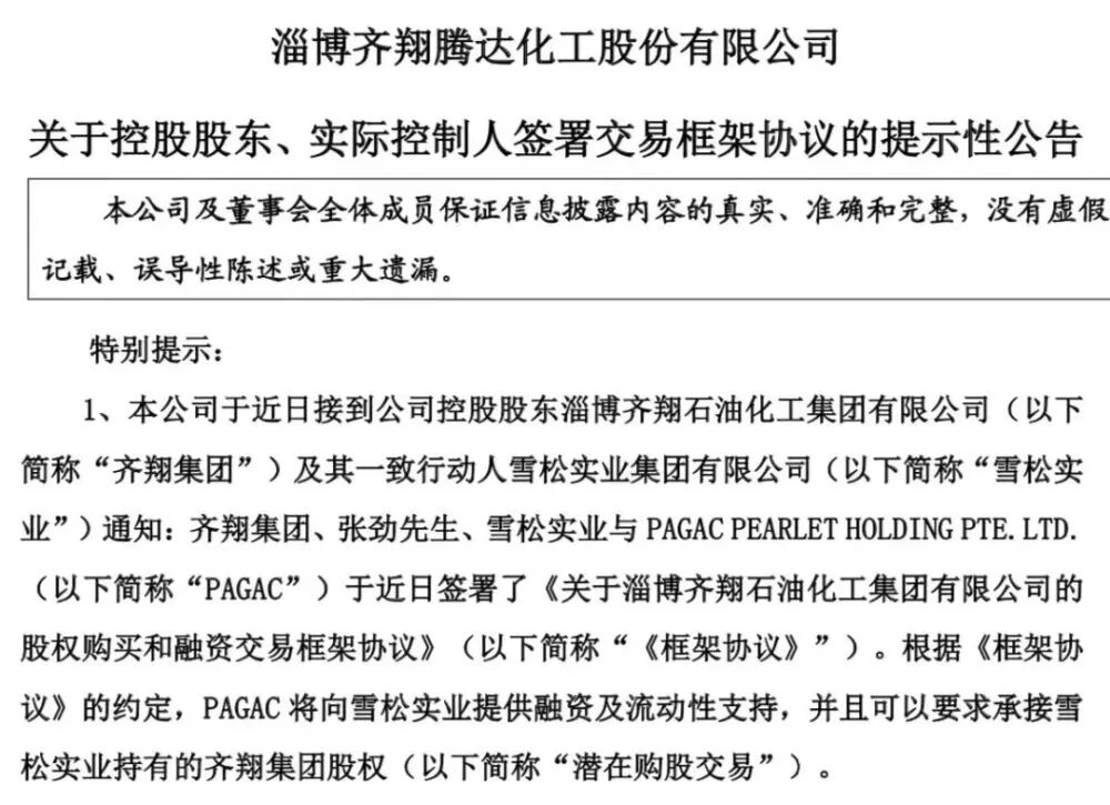 3月16日,据亮点好房编辑了解,控股股东齐翔集团及其一致行动人雪松实业、实际控制人张劲基于自身资金需求,同意转让公司控制权。拟接盘方为知名的资管公司太盟投资集团。