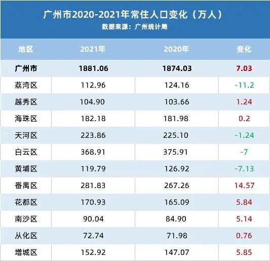 据亮点好房编辑了解,广州市统计局数据显示,2020-2021年,广州新增常住人口仅7万,除了荔湾老城区,就连年轻的天河、黄埔,甚*常年榜一的白云,也挡不住人口外流。