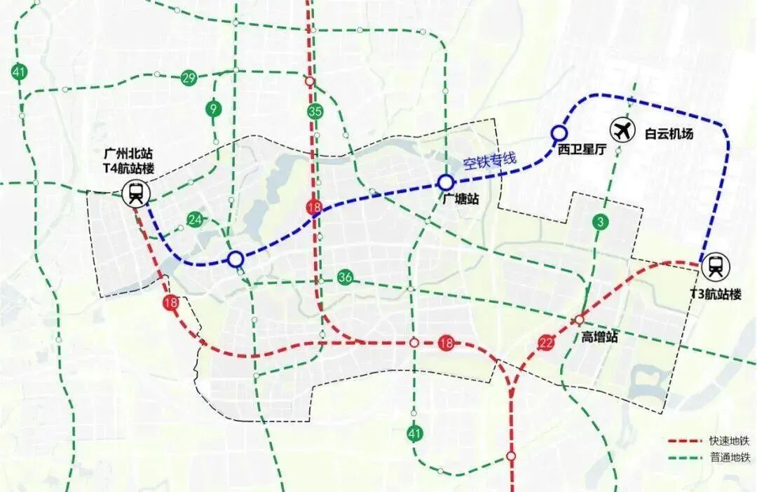 项目距离新白广城际(在建)与地铁18号线北延线(在建)交汇的花城街站1.2公里。据广州日报报道,线路将力争在2026年底建成开通,届时将实现1站广州北站,2站白云机场,4站白云新城,8站珠江新城。