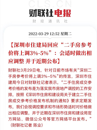 据财联社3月29日报道,针对日前市场有关“深圳二手房参考价将上调3%-5%”的传言,深圳市住建局今日对财联社记者表示,“二手住房成交参考价格的发布是为落实我市房地产调控的工作安排,按照《深圳市住房和建设局关于建立二手住房成交参考价格发布机制的通知》要求定期发布,我们会视调控要求和市场形势适时对价格做出相应调整,并于近期在深圳市住房和建设局官方网站、微信公众号等官方网络平台发布。”