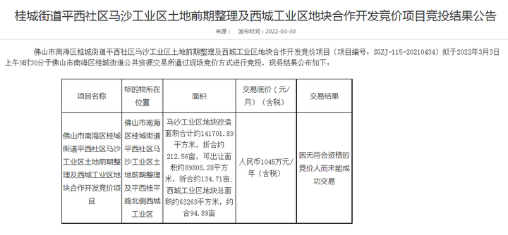 据亮点好房编辑了解,3月30日,佛山南海区政府网站发布了平西社区马沙工业区土地前期整理及西城工业区地块合作开发竞价项目的竞投结果公告,公告指出,项目因无符合资格的竞价人而未能成功交易。