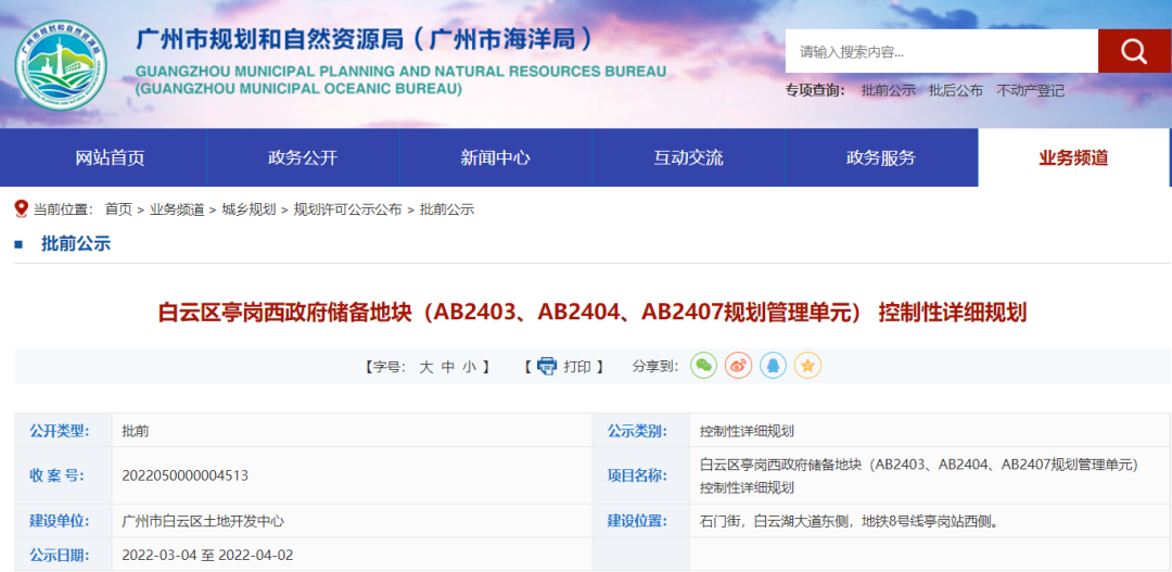 据亮点好房编辑了解,3月初,白云湖亭岗片区政府储备地块控规优化调整。